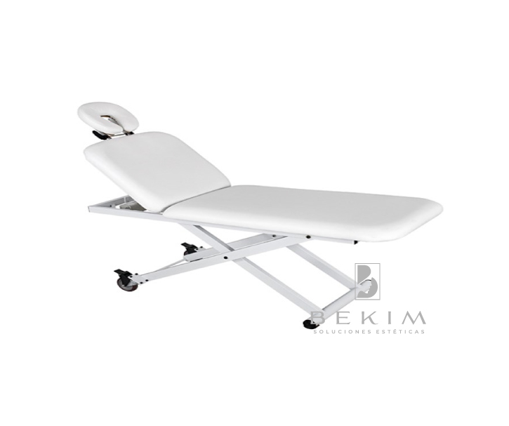 Camilla de 2 cuerpos con estructura metálica muy estable. Equipada con 1 motor que permite regular la altura. Respaldo regulable mediante pistón de gas. Reposacabezas regulable y extraíble. Incluye 2 ruedas que facilitan su desplazamiento. Tapizado blanco en PU de alta calidad y fácil de limpiar